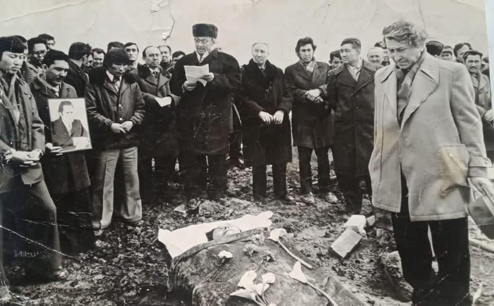 Автор бұл суретті ұзақ жыл сақтап келіпті. Қазақтың ақиық ақыны Мұқағали Мақатаевты ақтық сапарға аттандыру сәті. Елдің алдында арыстай болып алпамсадай Мұқаң жатыр. Бет-жүзі ашық. Сол заманның салты. Жетпіс алтыншы жылғы наурыздың соңғы күндерінің бірі.
